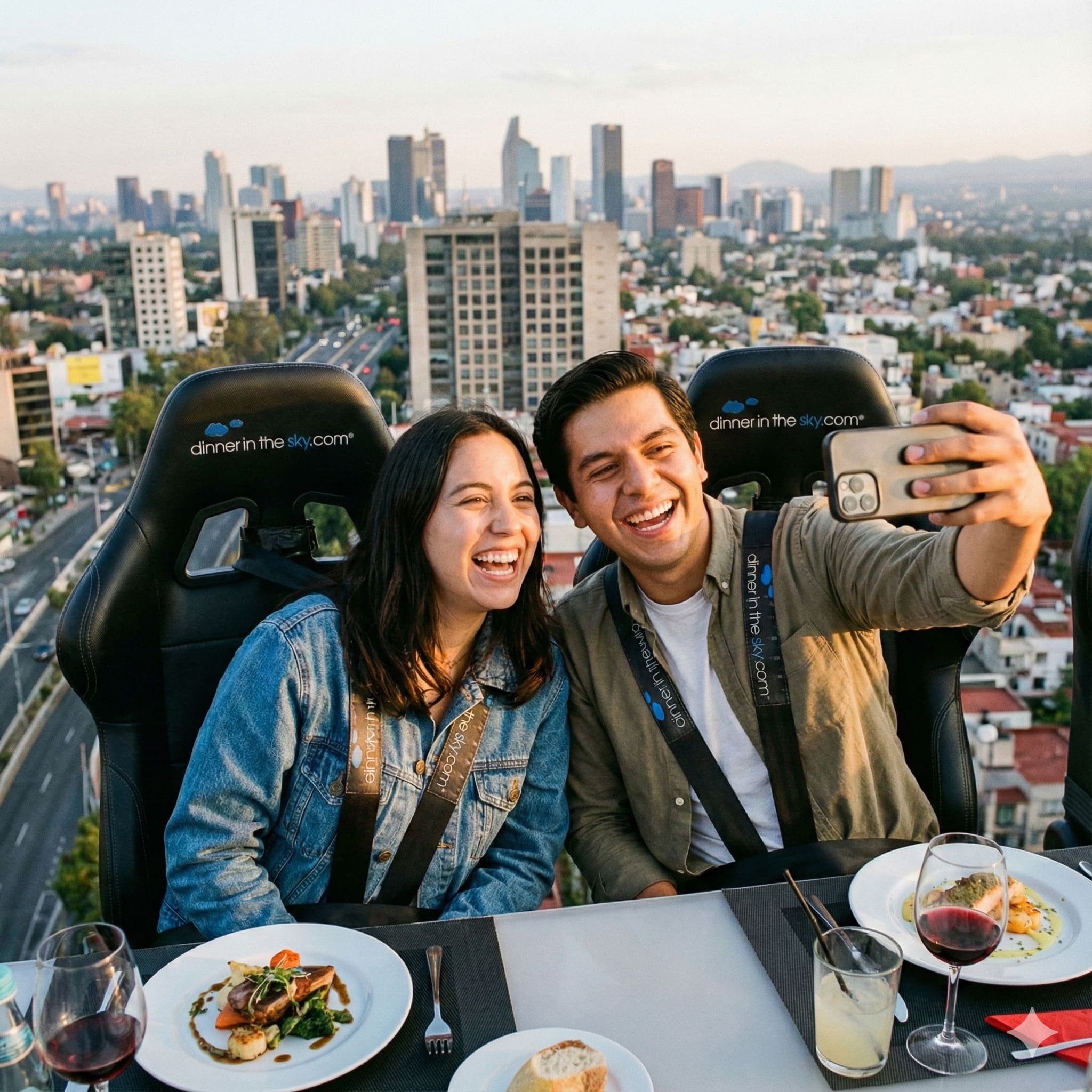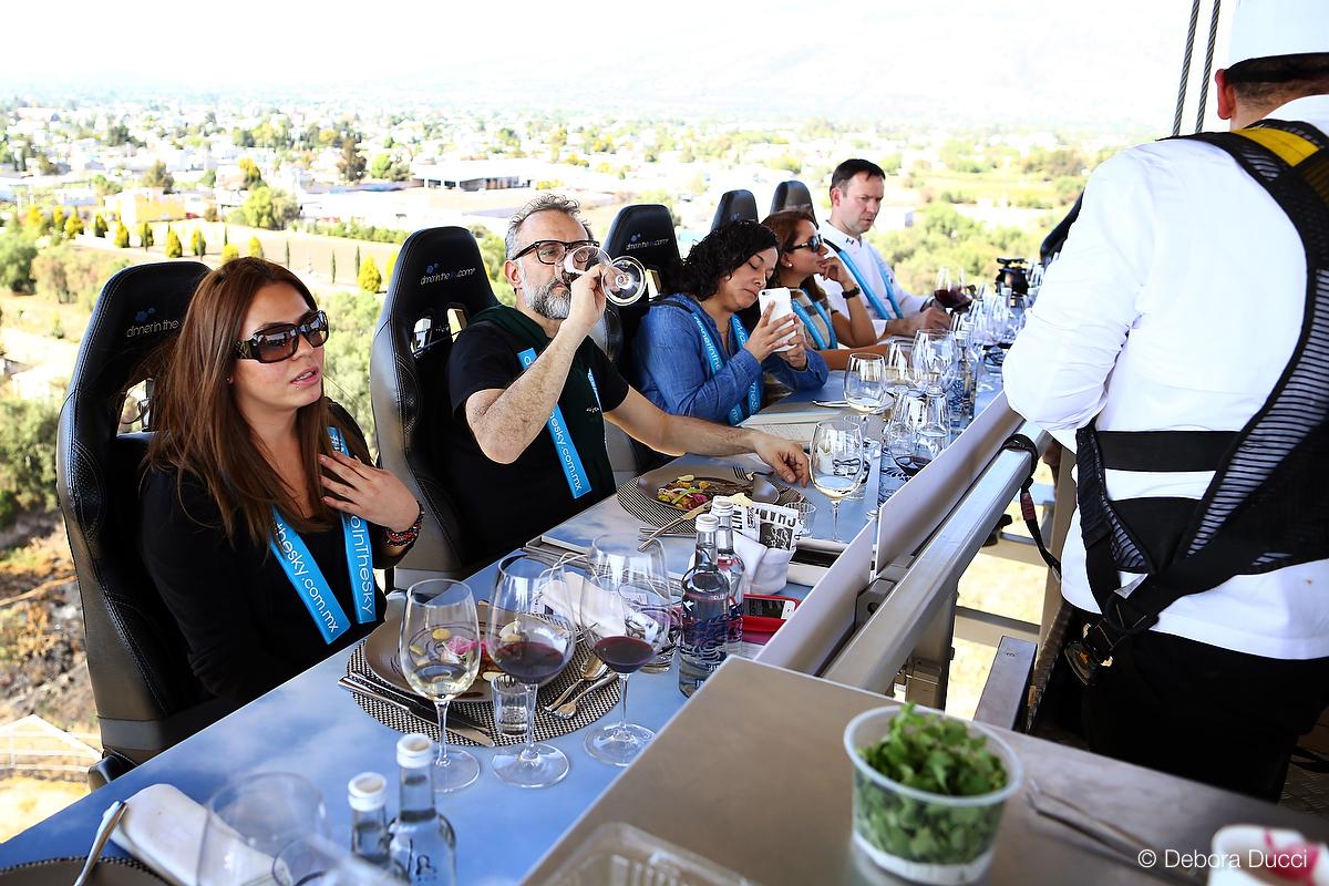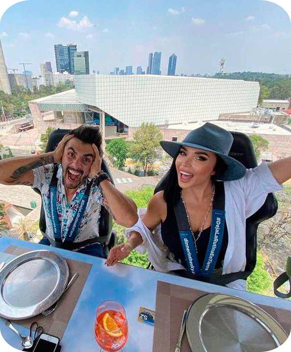 Sube a lo extraordinario. Una grúa eleva tu mesa para que disfrutes de alta cocina y mixología con las mejores vistas panorámicas de la ciudad.